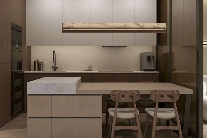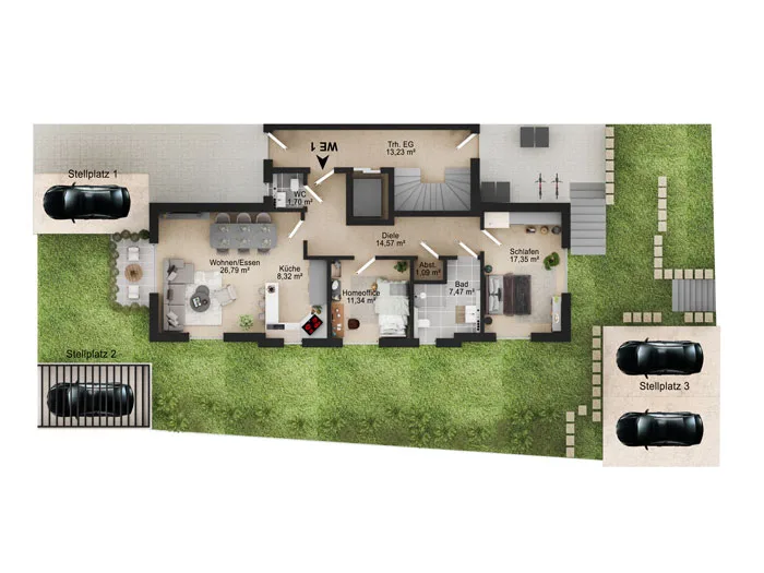 Die Aufteilung der Wohnung ist sehr praxisgerecht: Eingangsbereich mit Flur, modernes Gäste-WC, ein flexibel nutzbares Arbeits- oder Gästezimmer, ein geräumiges Schlafzimmer, ein hochwertig ausgestattetes Badezimmer mit barrierefreier Dusche sowie ein Abstellraum innerhalb der Wohnung. Bei der Ausstattung werden hochwertige Materialien vorgesehen. Zur Wahl stehen edles Echtholzparkett oder hochwertige Fliesen. Badezimmer und Gäste-WC erhalten Marken-Sanitär und moderne Fliesen.