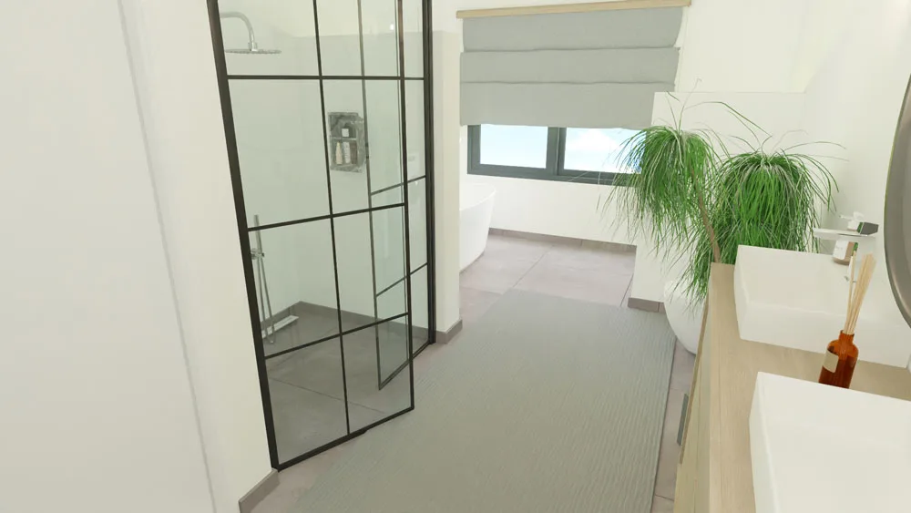 Das hochwertig ausgestattete Badezimmer verfügt über eine Badewanne und eine bodengleiche, begehbare Dusche. Das Schlafzimmer ist mit einem begehbaren Ankleidezimmer verbunden und schafft damit zusätzlichen Stauraum sowie ein angenehmes Wohngefühl.