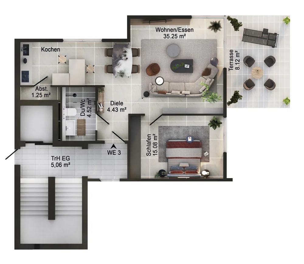Die Wohnung überzeugt durch eine durchdachte Raumaufteilung, ein praktischer Abstellraum, ein modernes barrierefreies Duschbad, ein ruhiges Schlafzimmer sowie ein offener Wohnbereich mit Küche und Essplatz, von dem aus Sie direkt auf die sonnige Terrasse gelangen, perfekt zum Entspannen oder für gesellige Stunden im Freien.