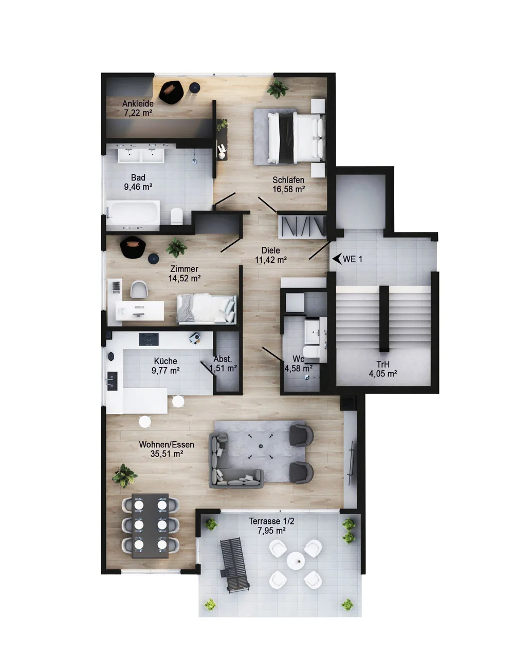 Der zentrale Raum der Wohnung ist das großzügige, lichtdurchflutete Wohn- und Esszimmer mit offener Küche. Von hier aus haben Sie direkten Zugang zur Terrasse, die einen wunderschönen Blick in die grüne Umgebung bietet ,der perfekte Ort zum Entspannen und Genießen.
